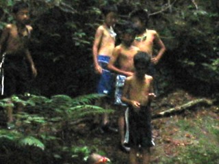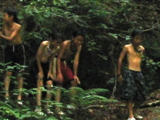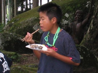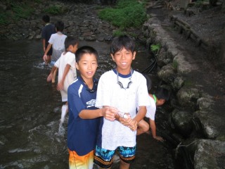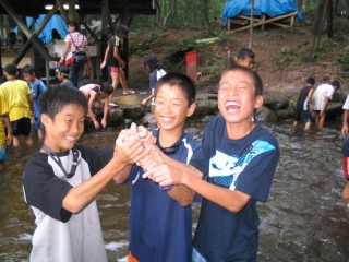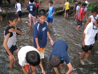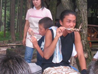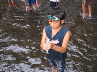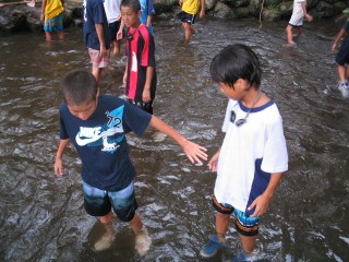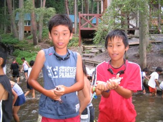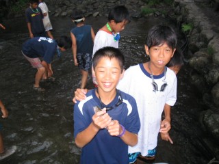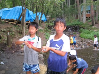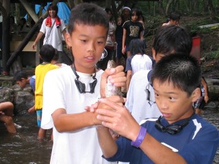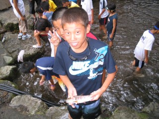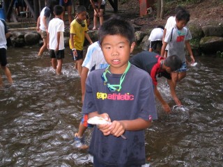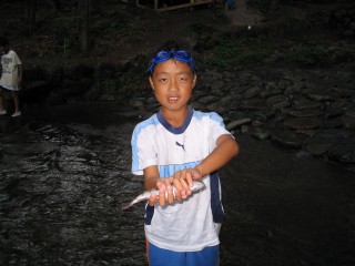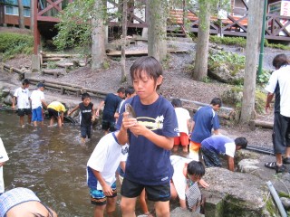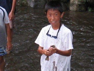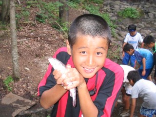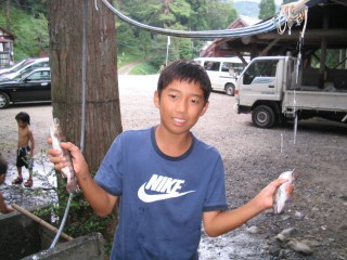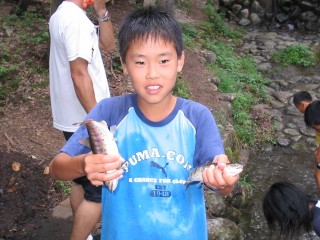 | マス掴みはもう手馴れた様子。この後竹串に刺して焼いて食べました。とってもおいしかったね。 | ||||