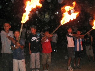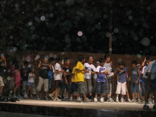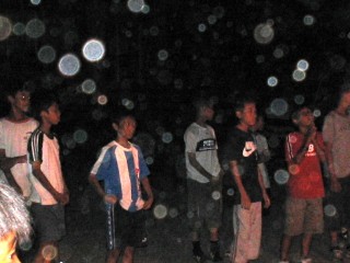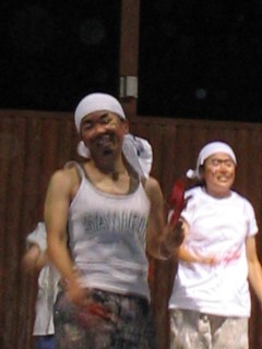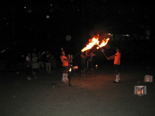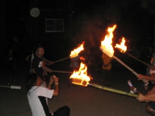 | ↑無事やぐらに火がついて一安心、 | ↑さて今からオンステージ。ちょっぴり幻想的。 | ||