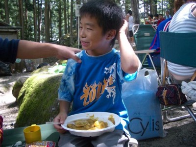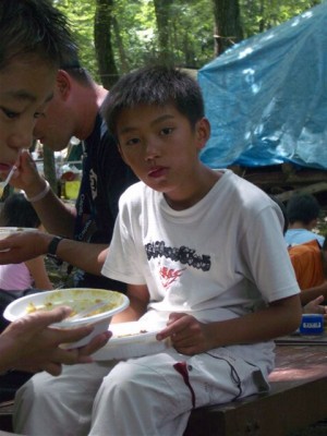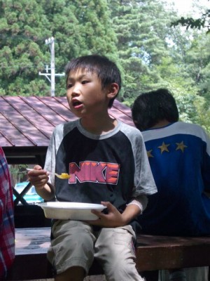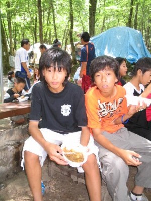 | 真剣に食べてます。 | 全員2杯目? | ネェ、カレーって何語? | カレー語。 ん?ジャガイモ語?にんじ・・・ん? |