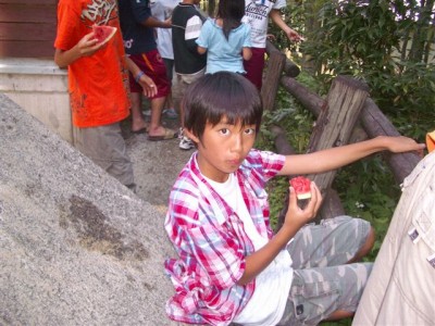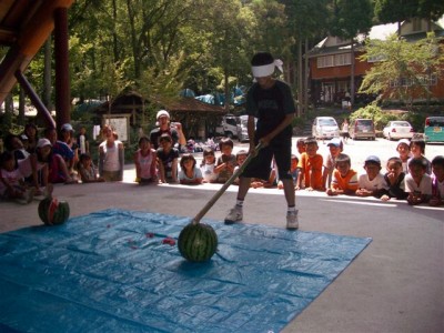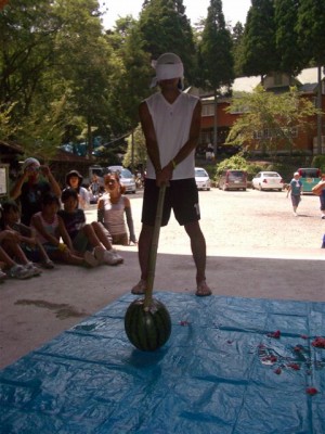 | ステージから落ちないように。 | 見事、命中! | 種、埋めると来年スイカが生るよ。 | ホントに? |