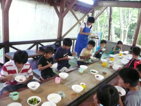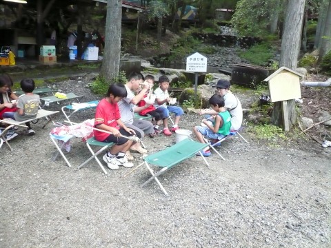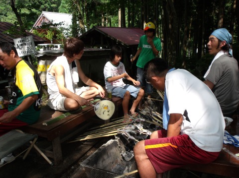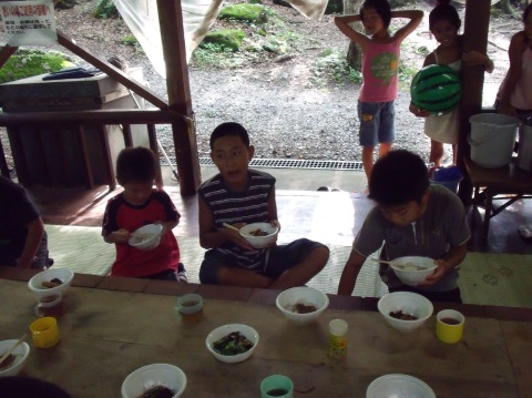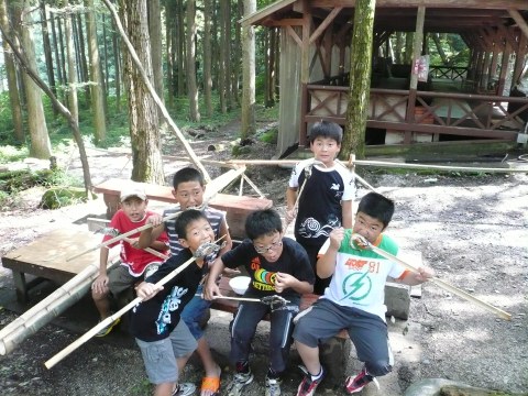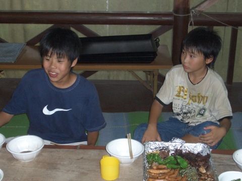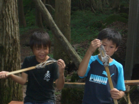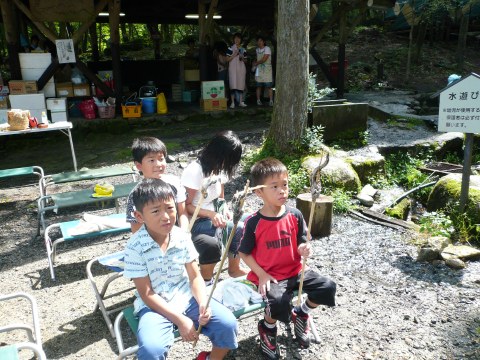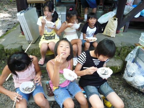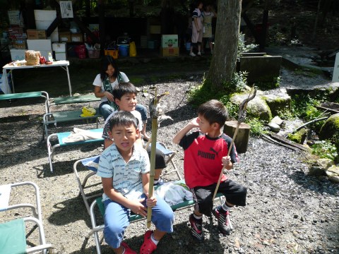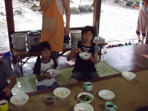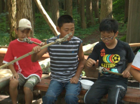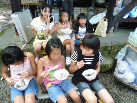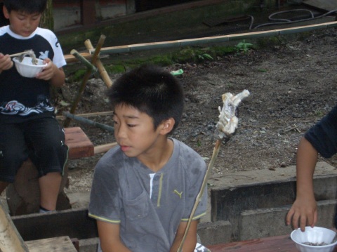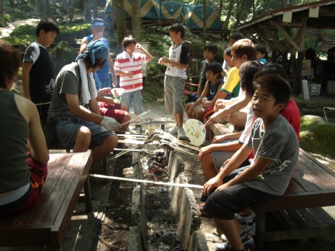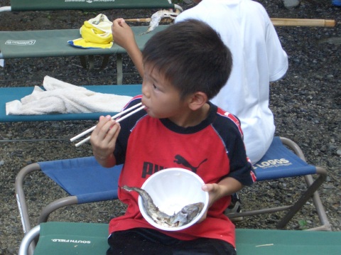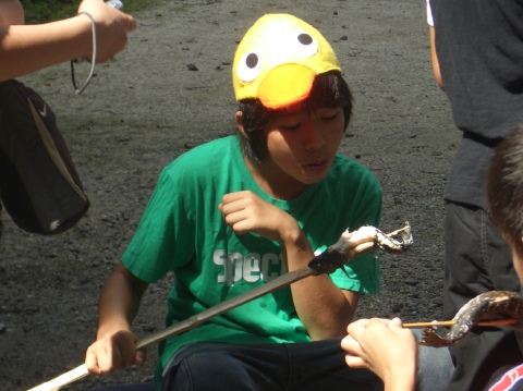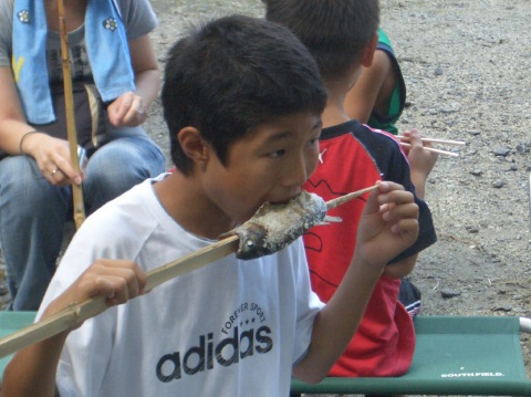 | 自分で捕った魚を焼いて食べる。君たちはもぅ、森の住民だ。 | ||||