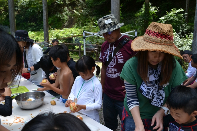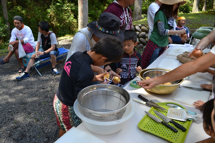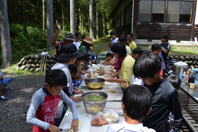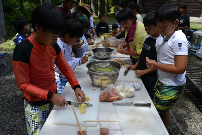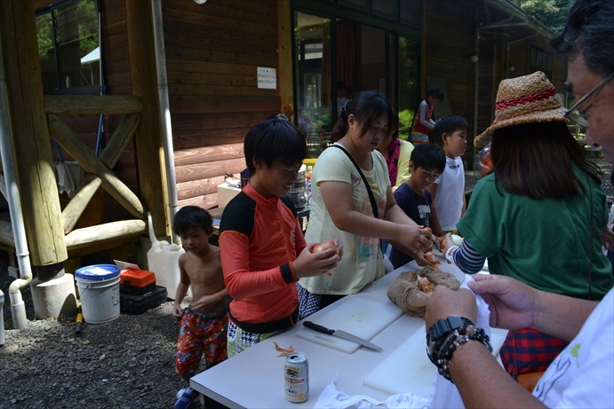 みんなで食事の用意です。自分で食べるものは自分でやらないと。