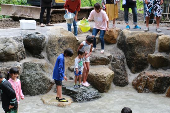 川は昨夜の雨で水かさが増していたので場所を変更。今製作中の釣り堀に水を溜めてもらいました。